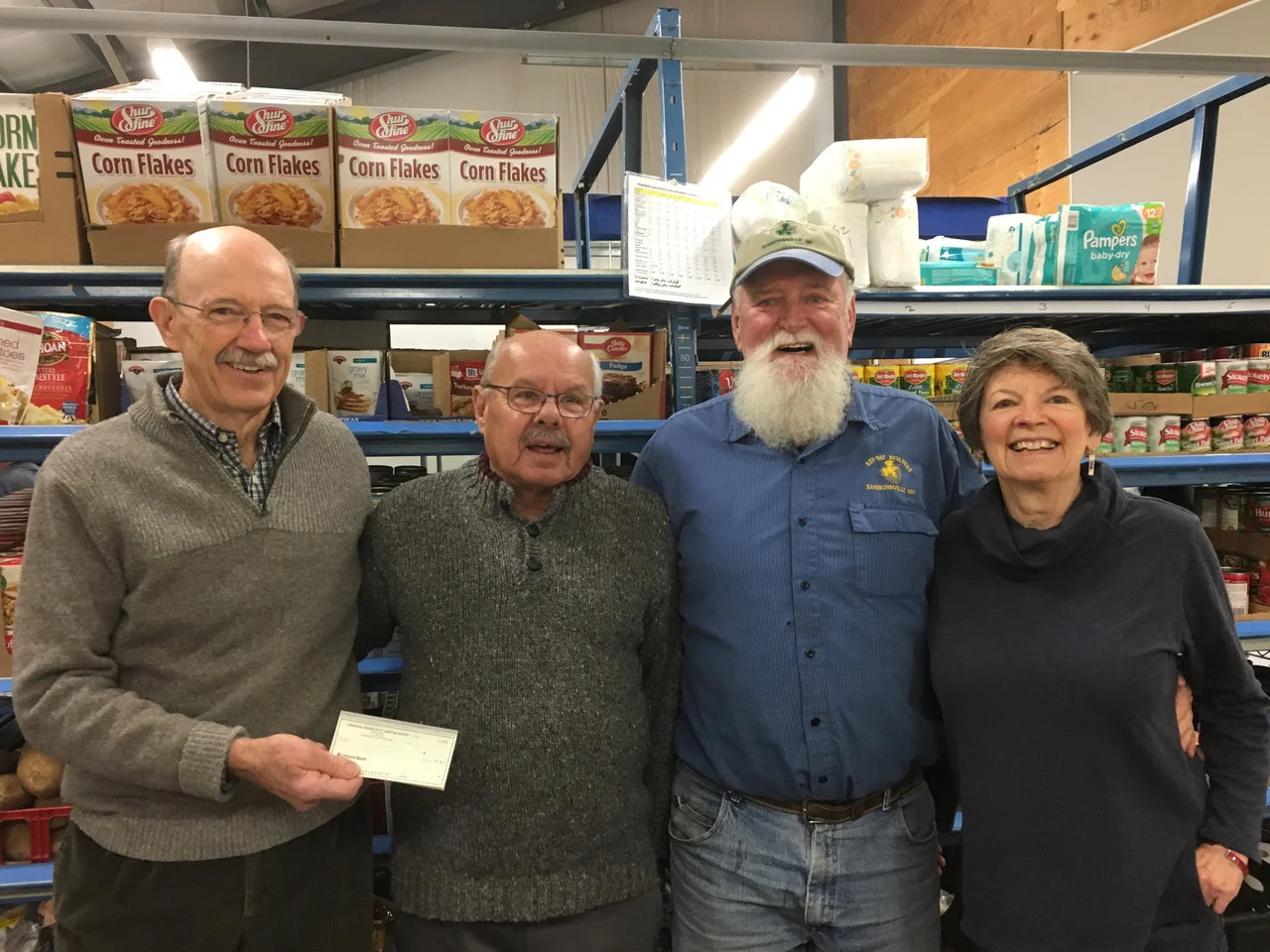 StJB EpiscoGolf’s Peter Campbell (L) and Jimbo Keating (blue shirt) presents WFP’s Howie Knight (2nd L) and Janet Miller (R) a check from EpiscoGolf 2018, at the Wakefield Food Pantry.
