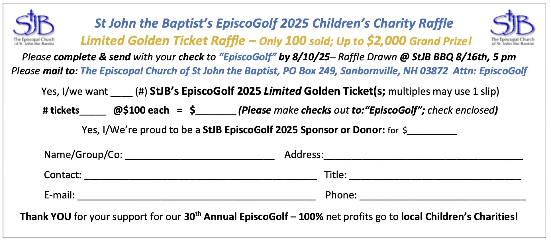 Buy a StJB EpiscoGolf 2025 Limited Golden Raffle Ticket. Only 100 tickets ($100 each; buy solo or split w/ a friend or group) will be sold for a chance to win up to $2,000 (20% of raffle intake).